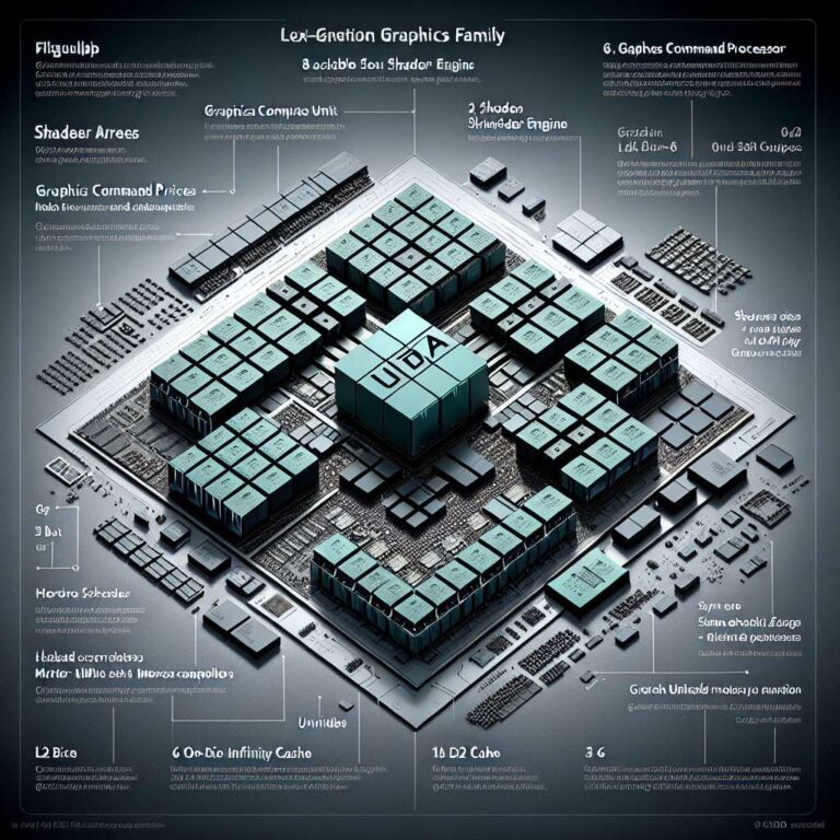 Mapping the diagrams to specific configurations produces numbers consistent with the 96 compute unit claim. The flagship layout is described as eight shader arrays with two shader engines per array, yielding sixteen shader engines. At six compute units per engine, that configuration reaches the 96 compute unit figure. A mid-tier design reduces the scale to four shader arrays and eight shader engines with five compute units per engine, which works out to about 40 compute units and an estimated six memory controllers for a 192-bit memory bus. The leak further shows smaller designs with roughly 24 compute units and 12 compute units built from smaller arrays and fewer memory controllers.