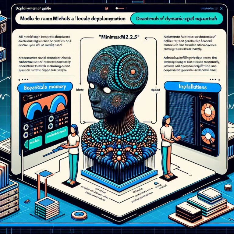 MiniMax provides recommended decoding parameters to balance quality and diversity: temperature=1.0, top_p = 0.95, and top_k = 40. Default settings for most tasks are summarized as temperature = 1.0, top_p = 0.95, top_k = 40, repeat penalty = 1.0 or disabled, maximum context window of 196,608 tokens, Min_P = 0.01 where the default might be 0.05, and a default system prompt that sets the assistant persona and name as MiniMax-M2.5 built by MiniMax. For running locally, the guide walks through building the latest llama.cpp with CMake, cloning from GitHub, and compiling targets such as llama-cli, llama-server, and llama-gguf-split. Users can load the model via llama-cli using a Hugging Face URI like unsloth/MiniMax-M2.5-GGUF:UD-Q3_K_XL, configure a cache directory with the LLAMA_CACHE environment variable, and adjust flags including –ctx-size 16384, –flash-attn on, –temp 1.0, –top-p 0.95, –min-p 0.01, –top-k 40, –threads 32, and –n-gpu-layers 2 for GPU offloading or CPU-only inference. The model weights can be downloaded with the Hugging Face CLI using patterns such as “*UD-Q3_K_XL*” or “*Q8_0*” to select the desired quant, and the 3-bit UD-Q3_K_XL quant is highlighted as a practical default that fits in a 128GB RAM device.